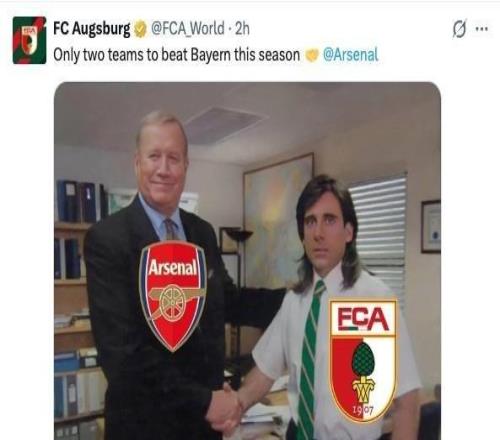 奥格斯堡晒和阿森纳握手梗图:本赛季只有两支球队能击败拜仁