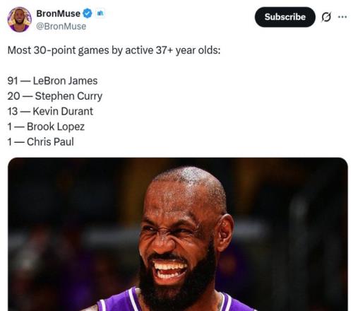 同时本场是詹姆斯37岁后第91次单场拿下30+得分表现,继续断档占据NBA历史第一,库里以20次排在第二。