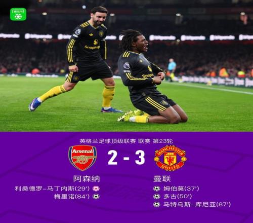 英格兰足球超级联赛第23轮,阿森纳主场对阵曼联。上半场,厄德高制造利马乌龙。苏比门迪送出乌龙助攻,姆伯莫扳平比分。下半场,多古轰入无解世界波,梅里诺利用角球机会扳平比分。不过,库尼亚很快再次轰入世界波。全场比赛结束,曼联客场3-2击败阿森纳,拿下两连胜。
