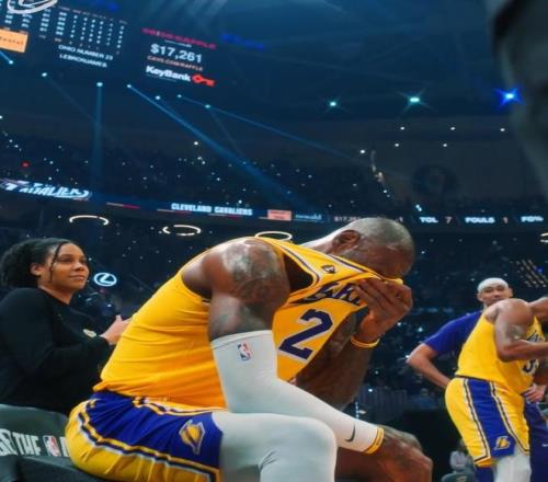 比赛暂停期间,骑士主场播放了致敬詹姆斯的视频,回顾了詹姆斯效力骑士时期的经典时刻。在场边观看的詹姆斯用球衣擦拭眼角。